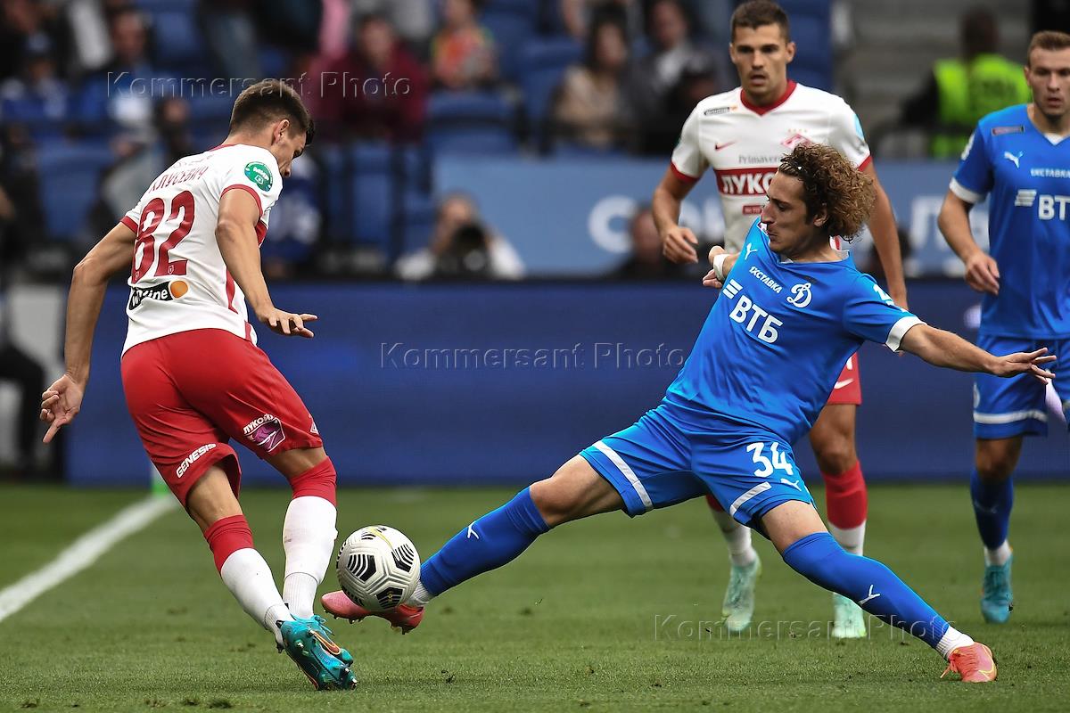 Российская Премьер-Лига (РПЛ). МИР - Чемпионат России по футболу 2022/2023. 6 тур. Матч между командами "Динамо" (Москва) - "Спартак" (Москва) на стадионе "ВТБ Арена". Игрок команды "Спартак" Михаил Игнатов (слева) во время матча.
