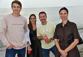 X annual Russian film festival of short films "Koroche". Party in the village of Yantarny as part of the festival. Left to right: director Natalya Meshchaninova, actor Alexander Robak and writer Yevgeny Grishkovets at a party.