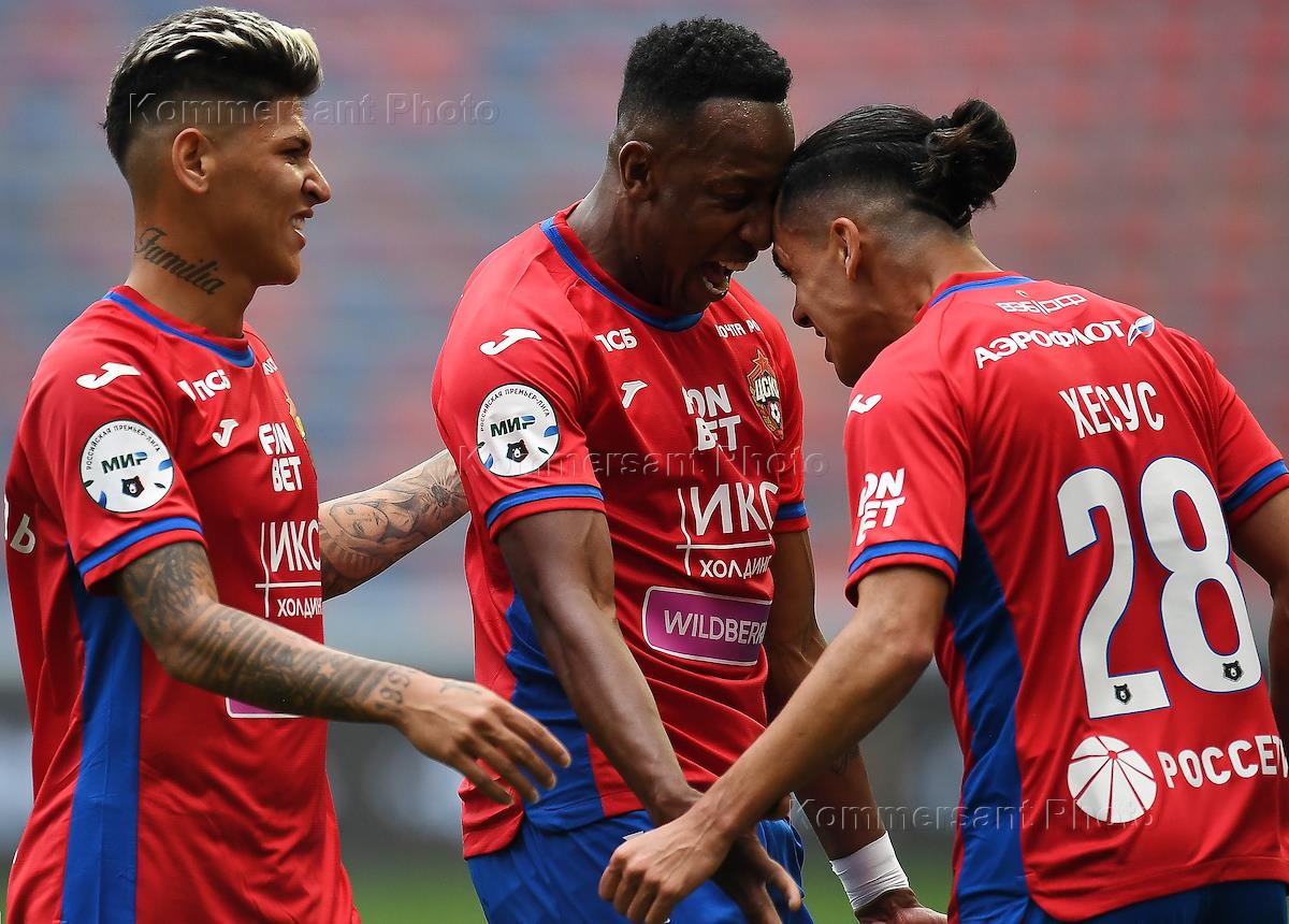 Российская Премьер-Лига (РПЛ). МИР - Чемпионат России по футболу 2022/2023. 6 тур. Матч между командами команды ЦСКА (Москва) - "Ахмат" (Грозный) на стадионе "ВТБ Арена". Слева направо: игроки команды ЦСКА Хорхе Карраскаль, Мойзес и Хесус Медина во время матча.