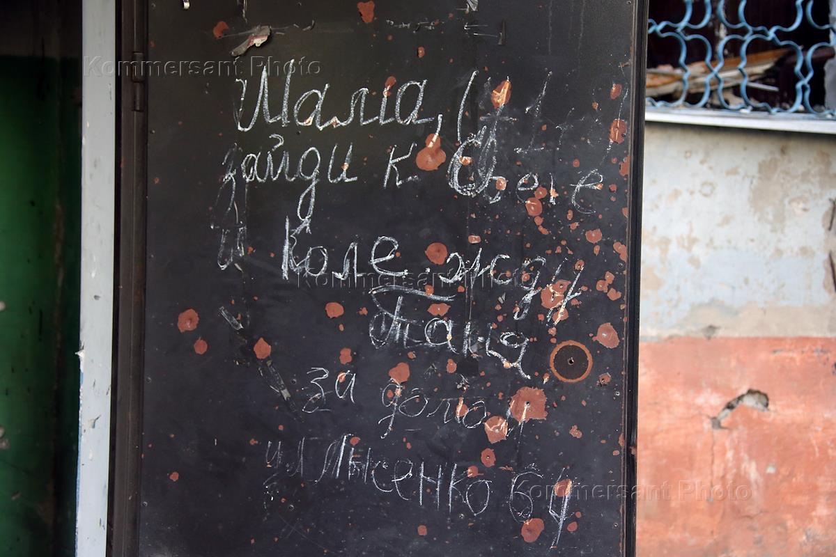 Types of Mariupol. Residential buildings after the fighting in the city. Genre photography. The inscription on the front door to the entrance of the house "Mom, come to Sveta and Kolya, I'm waiting for you, Tanya."