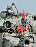 Форум "Армия-2022", в музейном комплексе "Самбекские высоты". Выставка военной техники на форуме. Жанровая фотография. Дети у макетов военного оружия.