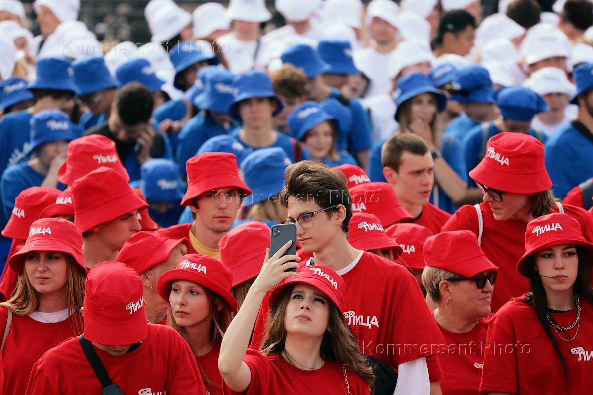 Празднование Дня государственного флага России на Поклонной горе. Жанровая фотография. Активисты во время патриотического флэшмоба.