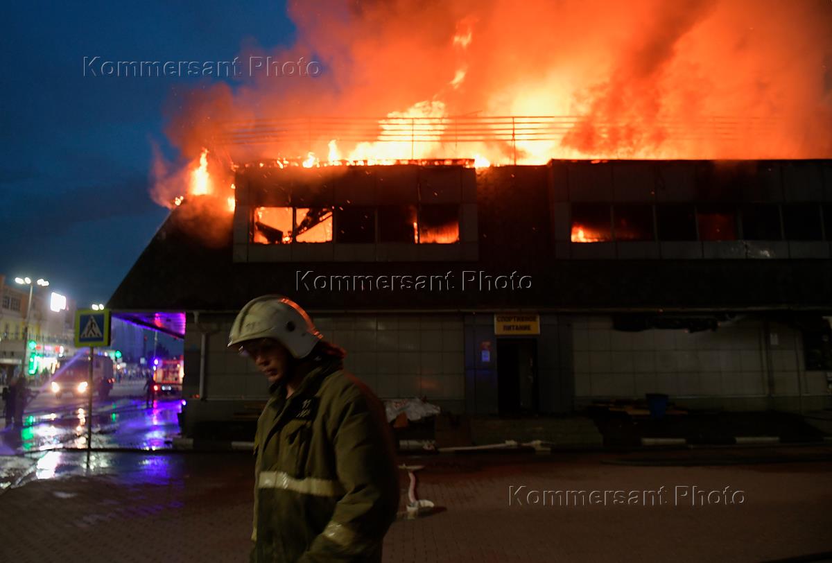 Пожар на кровле двухэтажного здания в Шараповском проезде. Сотрудники противопожарной службы МЧС России во время тушения пожара.