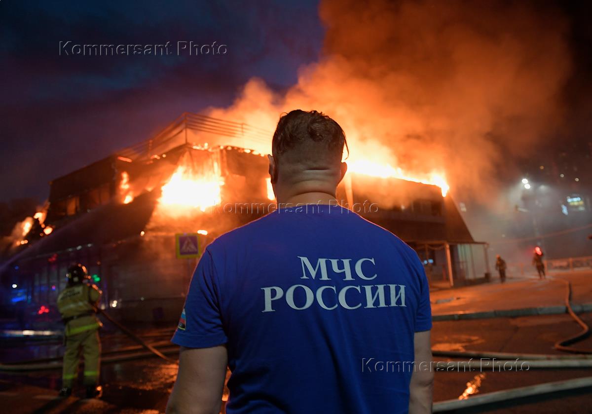 Пожар на кровле двухэтажного здания в Шараповском проезде. Сотрудник противопожарной службы МЧС России во время тушения пожара.