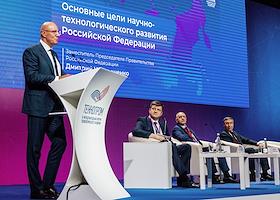 IX международный форум технологического развития "Технопром-2022" в Международном выставочном комплексе "Новосибирск Экспоцентр". Тема форума "Технологический суверенитет и устойчивое развитие России". Заместитель председателя правительства России Дмитрий Чернышенко (слева) и министр науки и высшего образования России Валерий Фальков (второй слева) на форуме.