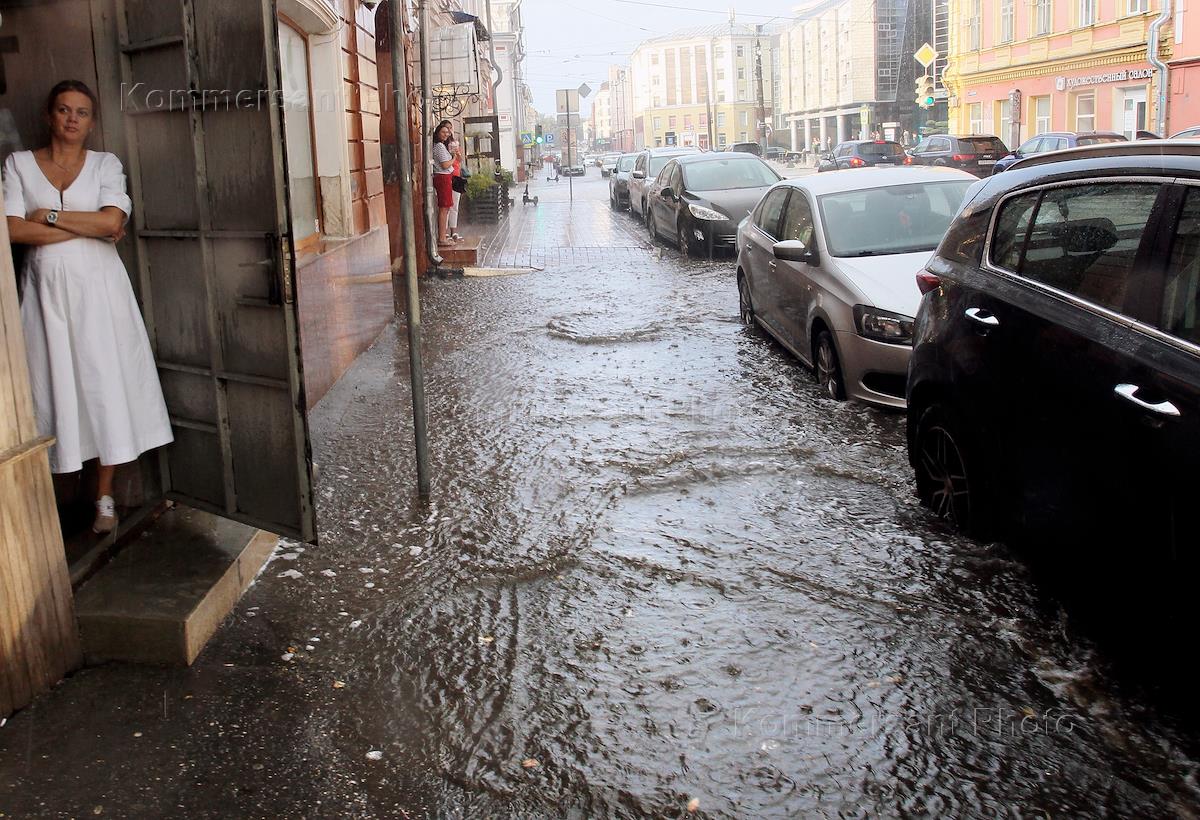 Виды Нижнего Новгорода. Жанровая фотография. Пешеходы на затопленном после ливня тротуаре в центре города.