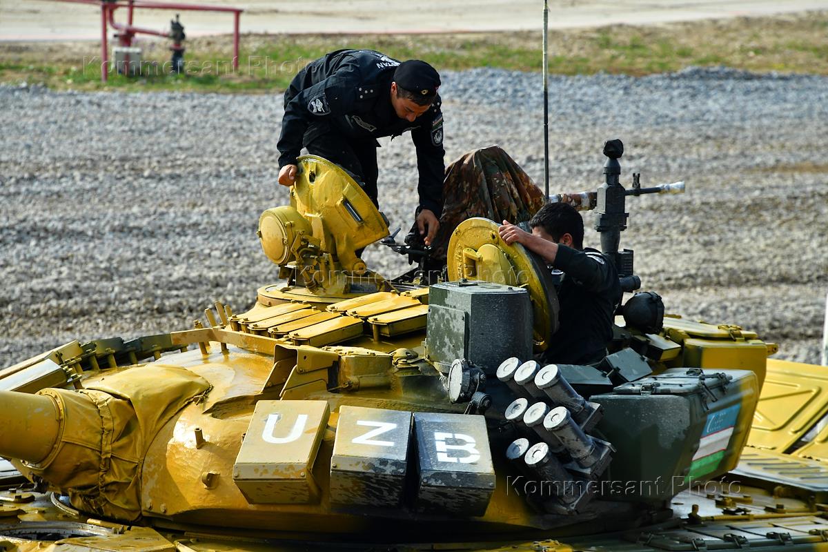 Армейские международные игры - 2022. Конкурс "Танковый биатлон". Финальный заезд соревнований танковых экипажей на военном полигоне "Алабино". Танк Т-72Б3 экипажа Республики Узбекистан во время соревнований.