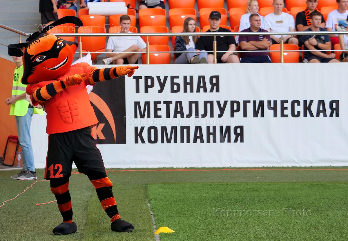 Российская Премьер-Лига (РПЛ). МИР - Чемпионат России по футболу 2022/2023. 7 тур. Матч между командами "Урал" (Екатеринбург) и "Зенит" (Санкт-Петербург) на стадионе "Екатеринбург-Арена". Аниматор в костюме Шмеля - талисмана футбольного клуба "Урал" на футбольном поле перед началом матча.