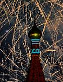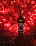 XV Международный военно-музыкальный фестиваль "Спасская башня" на Красной площади. Церемония открытия фестиваля. Жанровая фотография. Собор Покрова Пресвятой Богородицы на Рву (храм Василия Блаженного) на фоне фейерверка.