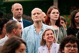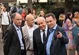 Церемония открытия выставки "Котел алхимика. Осязательный взгляд и незрительное восприятие". Часть первая в Галерее искусства стран Европы и Америки XIX–XX веков Государственного музея изобразительных искусств (ГМИИ) имени А.С.Пушкина. Заместитель генерального директора по взаимодействию с органами государственной власти ООО "ХК ЮэСэМ" Михаил Сеславинский (слева) и специальный представитель президента России по международному культурному сотрудничеству Михаил Швыдкой (второй справа) перед началом церемонии.