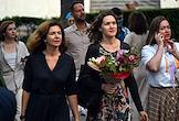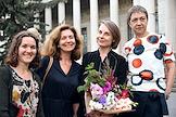 Церемония открытия выставки "Котел алхимика. Осязательный взгляд и незрительное восприятие". Часть первая в Галерее искусства стран Европы и Америки XIX–XX веков Государственного музея изобразительных искусств (ГМИИ) имени А.С.Пушкина. Начальник отдела междисциплинарных проектов ГМИИ им А.С.Пушкина Евгения Киселева (вторая справа) и куратор выставки, заведующая отделом искусства стран Европы и Америки XIX-XX веков Александра Данилова (справа) перед началом церемонии.