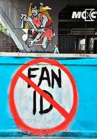 Виды Калининграда. Общественное пространство МОСТ - спортивный центр города, оснащенный одиннадцатью баскетбольными кортами для игры 3х3. Жанровая фотография. Граффити Fan ID (паспорт болельщика) перечеркнутый красной чертой.