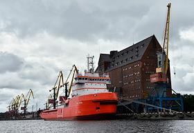 Виды Калининграда. Жанровая фотография. Ледокольное судно "Юрий Топчев", которое было задействовано в строительстве газопровода "Северный поток - 2", в Морском порту.