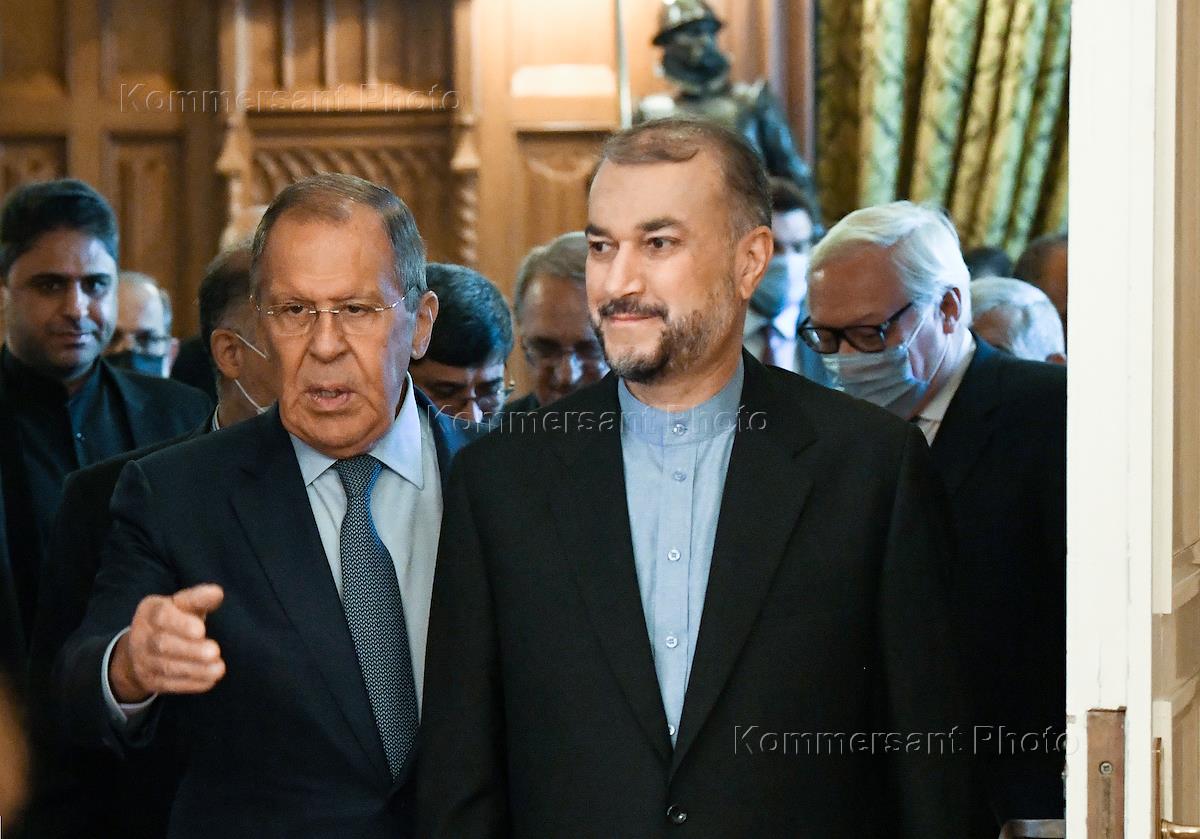 Russian Foreign Minister Sergei Lavrov (left) and Foreign Minister of the Islamic Republic of Iran Hossein Amir-Abdollahian (right) before the start of negotiations at the Reception House of the Russian Foreign Ministry.