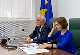 Президент Молдавии Майя Санду (в центре), глава Гагаузии Ирина Влах (справа) и председатель Народного собрания Гагаузии Дмитрий Константинов (слева) во время посещения Комратского университета (Гагаузия).