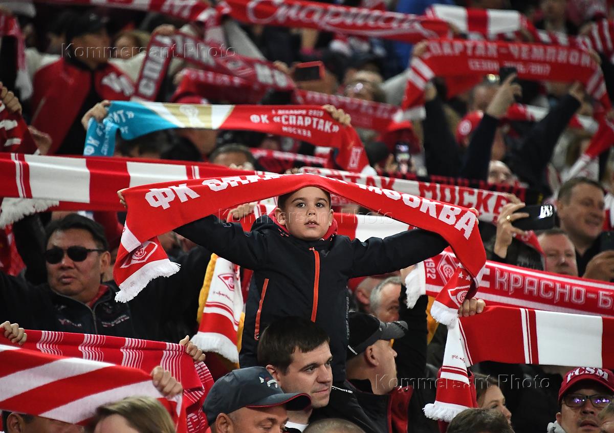 Российская Премьер-Лига (РПЛ). МИР - Чемпионат России по футболу 2022/2023. 8 тур. Матч между командами "Спартак" (Москва) - "Зенит" (Санкт-Петербург) на стадионе "Открытие Арена". Болельщики команды "Спартак" на трибуне во время матча.