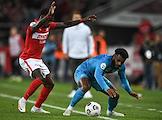 Российская Премьер-Лига (РПЛ). МИР - Чемпионат России по футболу 2022/2023. 8 тур. Матч между командами "Спартак" (Москва) - "Зенит" (Санкт-Петербург) на стадионе "Открытие Арена". Игрок команды "Спартак" Кристофер Мартинс Перейра (слева) и игрок команды "Зенит" Андрей Мостовой (справа) во время матча.