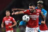 Российская Премьер-Лига (РПЛ). МИР - Чемпионат России по футболу 2022/2023. 8 тур. Матч между командами "Спартак" (Москва) - "Зенит" (Санкт-Петербург) на стадионе "Открытие Арена". Игрок команды "Спартак" Александр Соболев (справа) во время матча.