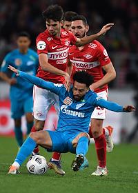 Российская Премьер-Лига (РПЛ). МИР - Чемпионат России по футболу 2022/2023. 8 тур. Матч между командами "Спартак" (Москва) - "Зенит" (Санкт-Петербург) на стадионе "Открытие Арена". Игрок команды "Зенит" Зелимхан Бакаев (слева) и игрок команды "Спартак" Мацей Рыбус (справа) во время матча.
