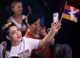 Митинг армянского оппозиционного "Движения сопротивление", посвященный Дню независимости Арцаха, на площади Франции. Участница митинга снимает на мобильный телефон.