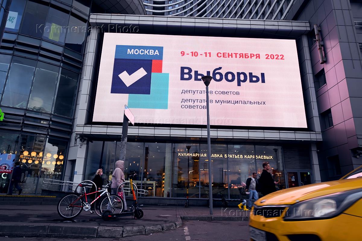 Виды Москвы. Жанровая фотография. Световые экраны с предвыборной агитацией Единого дня голосования 11 сентября на фасаде Торгового центра "Сокольники".