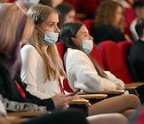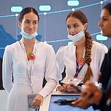 Восточный экономический форум (ВЭФ) 2022 на территории Дальневосточного федерального университета (ДВФУ) на острове Русский. Жанровая фотография. Сотрудницы Корпорации развития Дальнего Востока и Арктики в защитных медицинских масках на форуме.