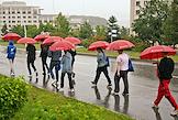 Восточный экономический форум (ВЭФ) 2022 на территории Дальневосточного федерального университета (ДВФУ) на острове Русский. Жанровая фотография. Участники форума под зонтами на территории университета.