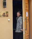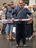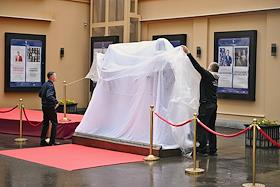 Церемония открытия памятника народным артистам СССР, актерам Государственного академического театра имени Евг. Вахтангова Василию Лановому, Владимиру Этушу и Юрию Яковлеву у Симоновской сцены Вахтанговского театра. Авторы проекта – скульптор Филипп Трушин и главный художник театра Вахтангова Максим Обрезков. Жанровая фотография. Подготовка к церемонии.