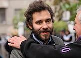 Церемония открытия памятника народным артистам СССР, актерам Государственного академического театра имени Евг. Вахтангова Василию Лановому, Владимиру Этушу и Юрию Яковлеву у Симоновской сцены Вахтанговского театра. Актер Александр Олешко на церемонии.