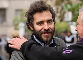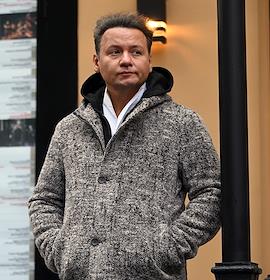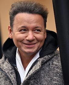 Церемония открытия памятника народным артистам СССР, актерам Государственного академического театра имени Евг. Вахтангова Василию Лановому, Владимиру Этушу и Юрию Яковлеву у Симоновской сцены Вахтанговского театра. Депутат Московской городской Думы, актер Евгений Герасимов на церемонии.