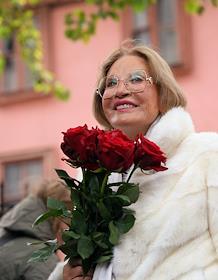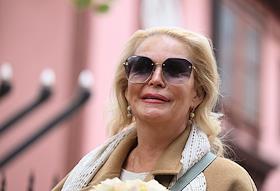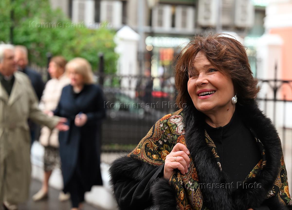 Церемония открытия памятника народным артистам СССР, актерам Государственного академического театра имени Евг. Вахтангова Василию Лановому, Владимиру Этушу и Юрию Яковлеву у Симоновской сцены Вахтанговского театра. Актриса Людмила Максакова на церемонии.