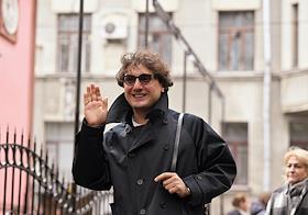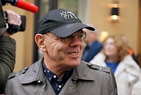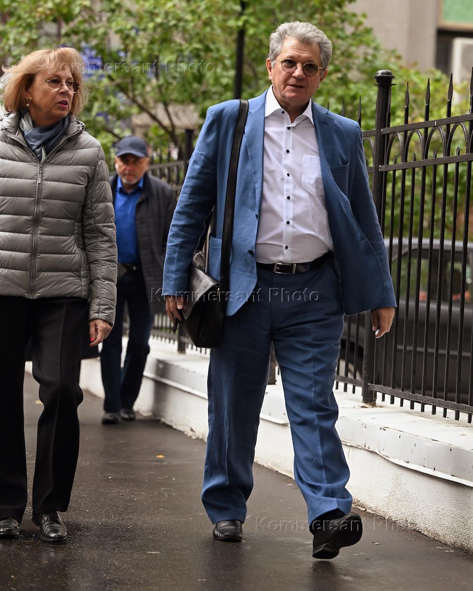 Церемония открытия памятника народным артистам СССР, актерам Государственного академического театра имени Евг. Вахтангова Василию Лановому, Владимиру Этушу и Юрию Яковлеву у Симоновской сцены Вахтанговского театра. Художественный руководитель театра "Сатирикон" имени Аркадия Райкина Константин Райкин на церемонии.