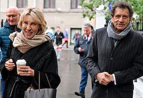 Церемония открытия памятника народным артистам СССР, актерам Государственного академического театра имени Евг. Вахтангова Василию Лановому, Владимиру Этушу и Юрию Яковлеву у Симоновской сцены Вахтанговского театра. Актриса Юлия Рутберг (слева) и ректор театрального училища имени Щукина, актер Евгений Князев (справа) на церемонии.