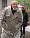 Церемония открытия памятника народным артистам СССР, актерам Государственного академического театра имени Евг. Вахтангова Василию Лановому, Владимиру Этушу и Юрию Яковлеву у Симоновской сцены Вахтанговского театра. Актер Юрий Васильев на церемонии.