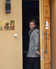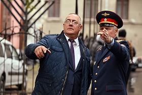 Церемония открытия памятника народным артистам СССР, актерам Государственного академического театра имени Евг. Вахтангова Василию Лановому, Владимиру Этушу и Юрию Яковлеву у Симоновской сцены Вахтанговского театра. Руководитель управления учебной и воспитательной работы Следственного комитета России Сергей Петров (слева) перед началом церемонии.