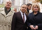 Церемония открытия памятника народным артистам СССР, актерам Государственного академического театра имени Евг. Вахтангова Василию Лановому, Владимиру Этушу и Юрию Яковлеву у Симоновской сцены Вахтанговского театра. Справа налево: заместитель министра культуры России Алла Манилова, директор Государственном академическом театре имени Евг. Вахтангова Кирилл Крок и актер Юрий Шлыков на церемонии.