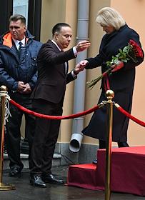 Церемония открытия памятника народным артистам СССР, актерам Государственного академического театра имени Евг. Вахтангова Василию Лановому, Владимиру Этушу и Юрию Яковлеву у Симоновской сцены Вахтанговского театра. Заместитель министра культуры России Алла Манилова (справа) и директор Государственном академическом театре имени Евгения Вахтангова Кирилл Крок (в центре) на церемонии.