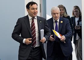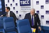 Пресс-конференция партии "Справедливая Россия - За правду", посвященная избирательной кампании 2022 года в информационном агентстве ТАСС. Первый заместитель руководителя фракции "Справедливая Россия - За правду" в Государственной думе (ГД) России Дмитрий Гусев (слева) и председатель партии "Справедливая Россия – За Правду", руководитель фракции "Справедливая Россия" в ГД России Сергей Миронов (справа) перед началом пресс-конференции.