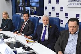 Пресс-конференция партии "Справедливая Россия - За правду", посвященная избирательной кампании 2022 года в информационном агентстве ТАСС. Сопредседатель партии "Справедливая Россия - за правду", председатель комитета Государственной думы России по делам национальностей Геннадий Семигин во время конференции.