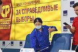 Пресс-конференция партии "Справедливая Россия - За правду", посвященная избирательной кампании 2022 года в информационном агентстве ТАСС. Жанровая фотография. Подготовка к проведению пресс-конференции.
