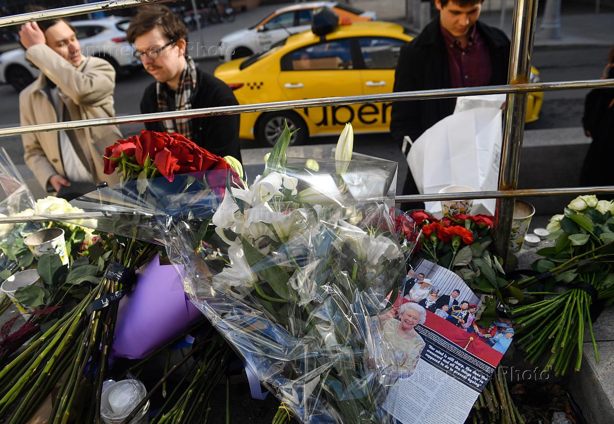 Цветы в память о королеве Великобритании Елизавете II у здания посольства Соединенного королевства Великобритании и Северной Ирландии в Москве.