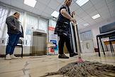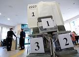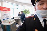 Single voting day. The work of the precinct election commission (PEC) No. 2227, located on the territory of the Khrustalny ice rink on Profsoyuznaya Street, 97, bldg. 1, on the first day of voting. Genre photography. Ballot boxes and police officers at the polling station.