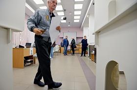 Single voting day. The work of the precinct election commission (PEC) No. 2238, located in the State Educational Institution of Higher Professional Education "Russian State Medical University" of Roszdrav on Akademika Volgina Street, 41, on the first day of voting. Genre photography. Voters at the polling station.