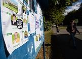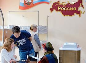 Single voting day. Genre photography. Election propaganda poster of candidates from the United Russia party.