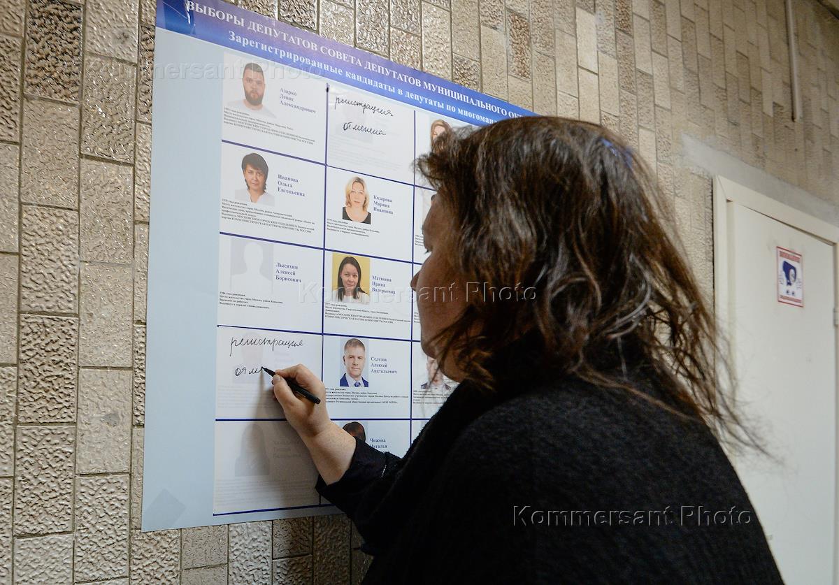 Single voting day. The work of the precinct election commission (PEC) No. 2238, located in the State Educational Institution of Higher Professional Education "Russian State Medical University" of Roszdrav on Akademika Volgina Street, 41, on the first day of voting. Genre photography. Voters at the polling station.