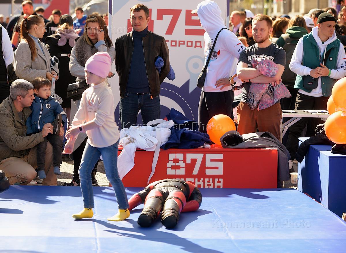 День города в Москве. Праздничные мероприятия, посвященные 875-й годовщине основания города Москвы на улице Охотный ряд. Участники показательных выступлений по борьбе.