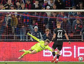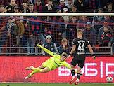 Russian Premier League (RPL). MIR - Russian Football Championship 2022/2023. Round 9 Match between the teams of CSKA (Moscow) - "Krasnodar" (Krasnodar) at the stadium "VEB Arena". Krasnodar goalkeeper Matvey Safonov (left) during a match.
