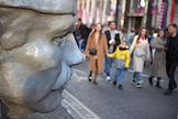 Жанровая фотография. Женщина в хиджабе и в маске трет уши собаки у скульптуры на станции метро площадь Революции.