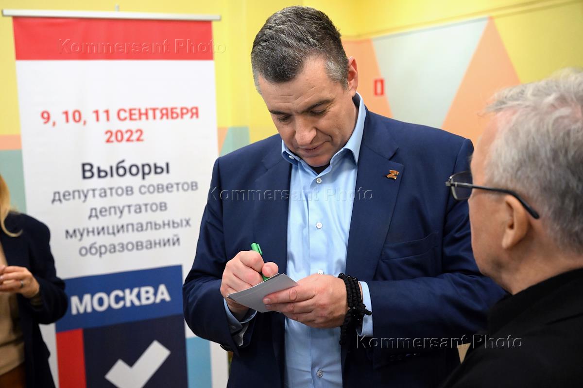 Единый день голосования. Председатель ЛДПР Леонид Слуцкий после голосования на муниципальных выборах в Москве на избирательном участке в школе № 1236.
