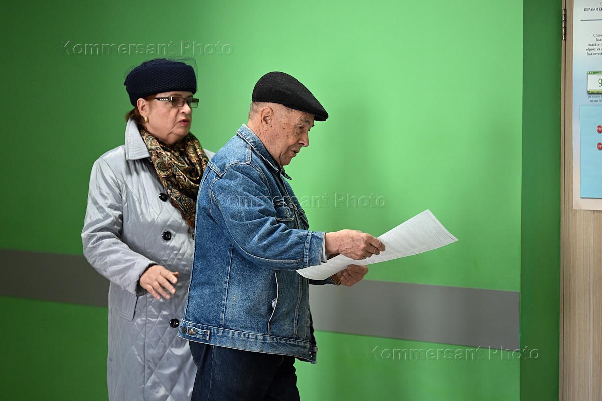 Единый день голосования. Выборы муниципальных депутатов Москвы на избирательном участке № 73. Избиратели во время голосования.
